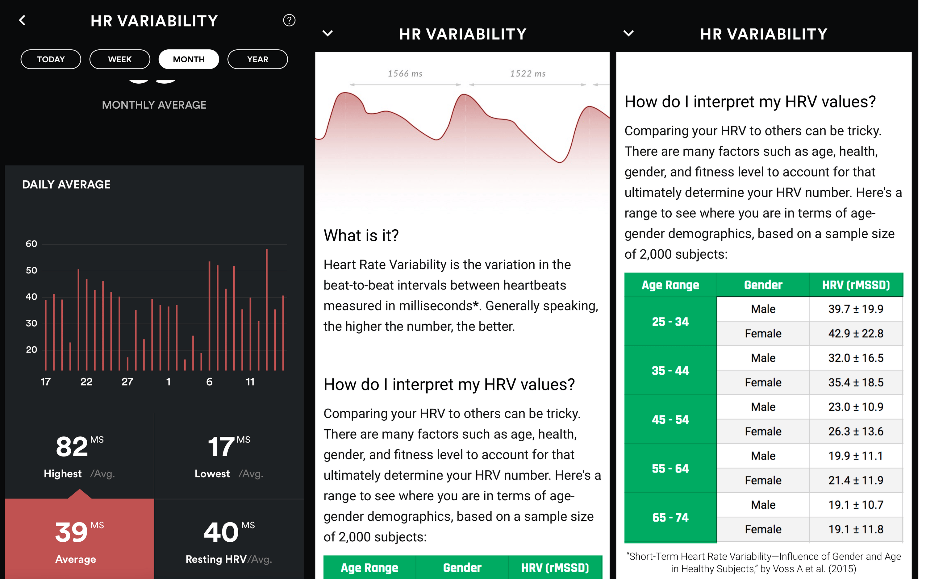 Die Herzfrequenzvariabilität (HRV) ist relativ neu und vielen unbekannt. Sie misst den Abstand zwischen den einzelnen Herzschlägen. Je höher die Variabilität zwischen den Abständen, desto besser ausgeruht ist man. Eine geringere Variabilität bedeutet, dass man gestresst oder überarbeitet sein könnte. HRV wurde mit Bluthochdruck, Fettleibigkeit, Diabetes und Problemen mit dem Immunsystem in Verbindung gebracht.