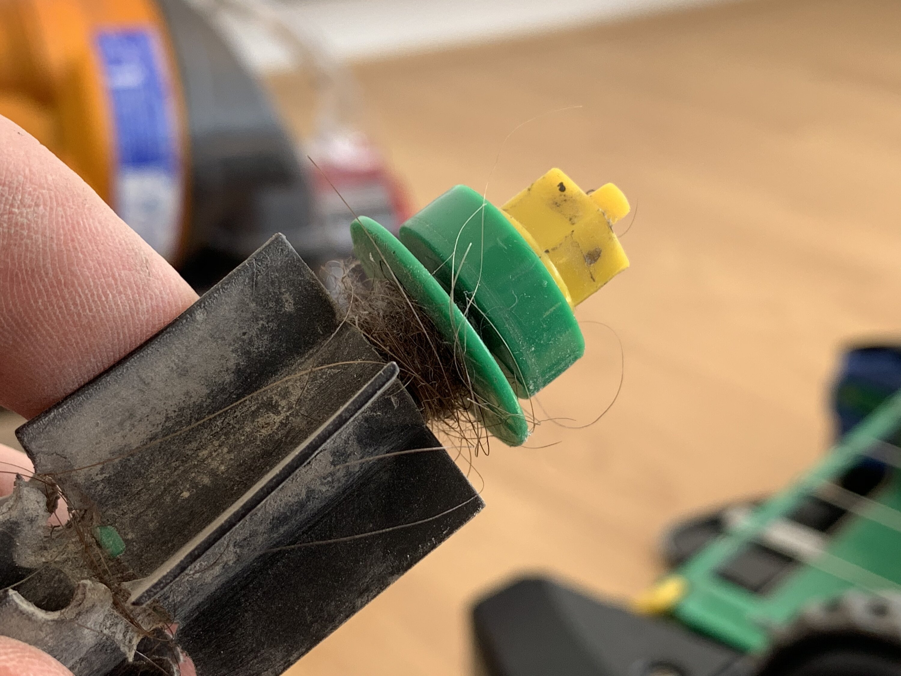 Ein weiteres Teil, das gelegentlich gewartet werden muss, ist der Reinigungskopf. Sie können darauf zugreifen, indem Sie das gesamte Gehäuse mit den Bürsten entfernen. Staub kann sich in der Nähe des Motors ansammeln und möglicherweise Hitzeprobleme verursachen. Drehen Sie ihn nach dem Entfernen um und bekämpfen Sie die Staubhasen, denen Sie begegnen!