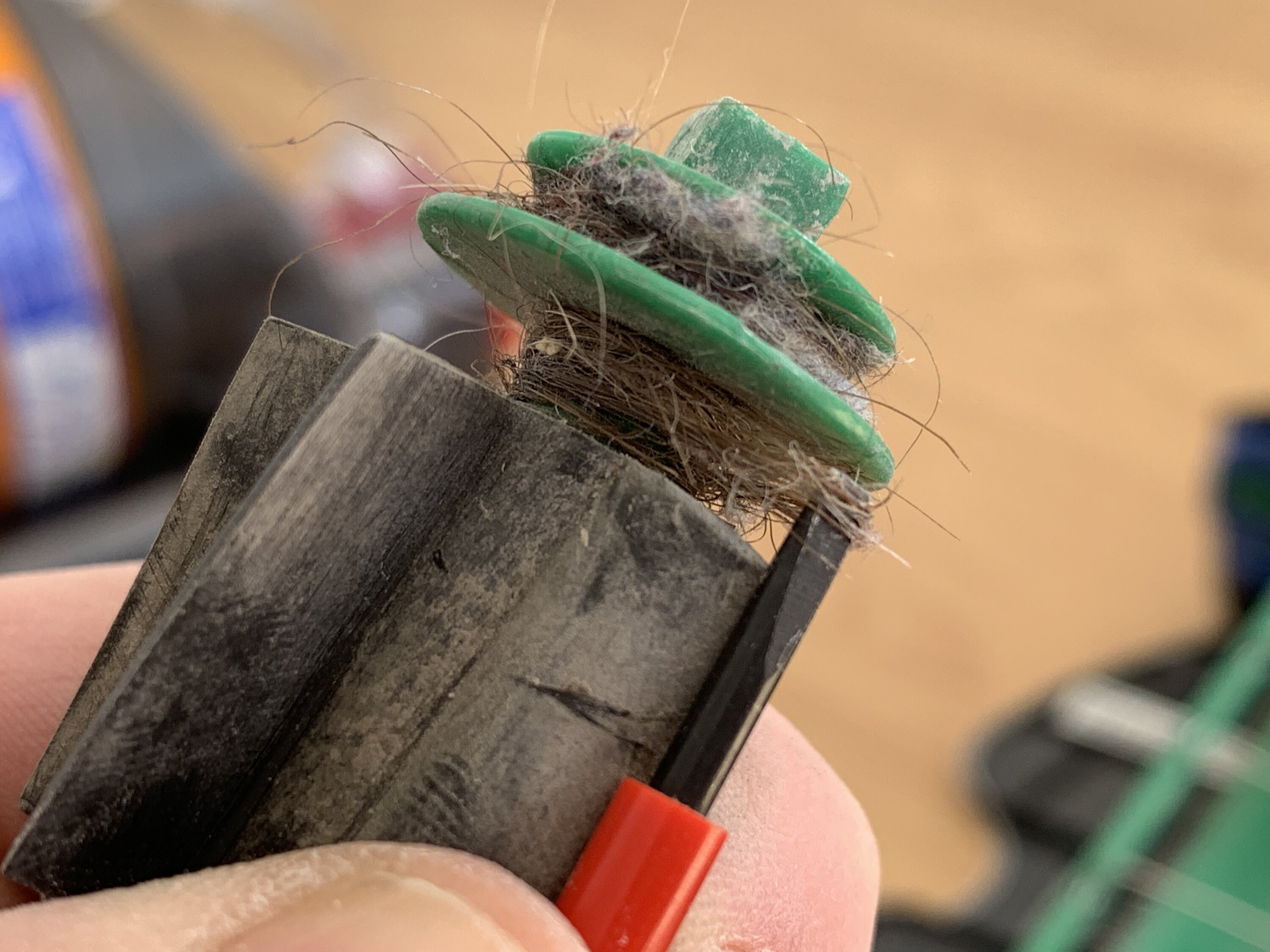 Der nächste Schritt besteht darin, Haare und Schmutz von den Bürsten zu entfernen. Schauen Sie sich beide Enden jeder Bürste genau an. Entfernen Sie die Kappen und überprüfen Sie die Unterseite. Verwenden Sie einen Schraubendreher (oder ein kleines Messer), um Haare abzuschneiden.