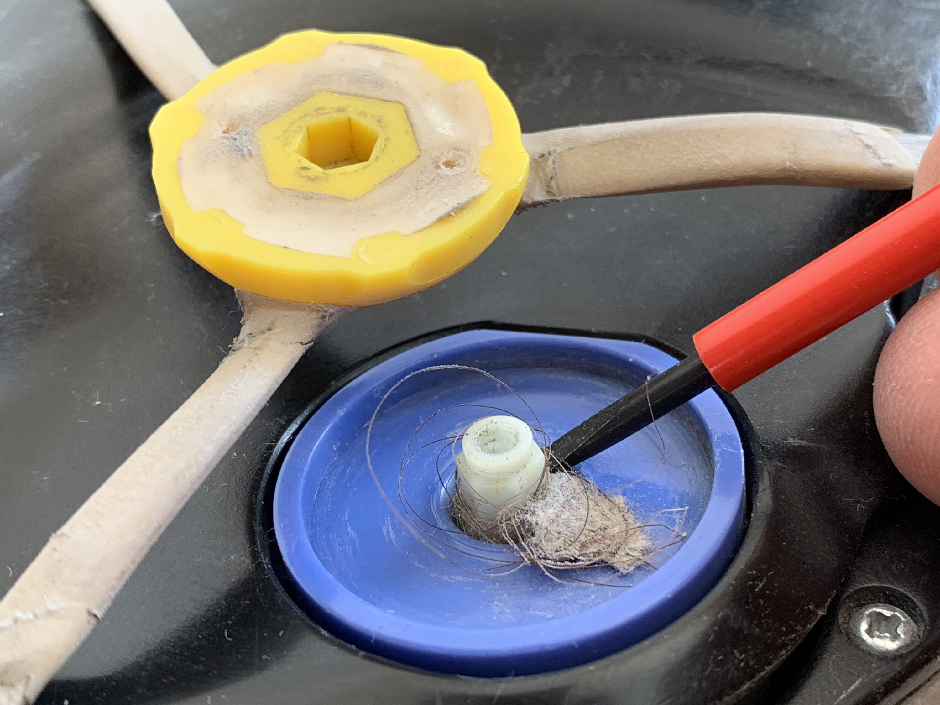 Die andere rotierende Bürste muss zum Entfernen durch Lösen einer Schraube gelöst werden. Verwenden Sie den kleinen Schraubendreher, um sie von ihrer Mittelachse zu lösen. Sie werden überrascht sein, wie viel Schmutz sich darunter verstecken kann...