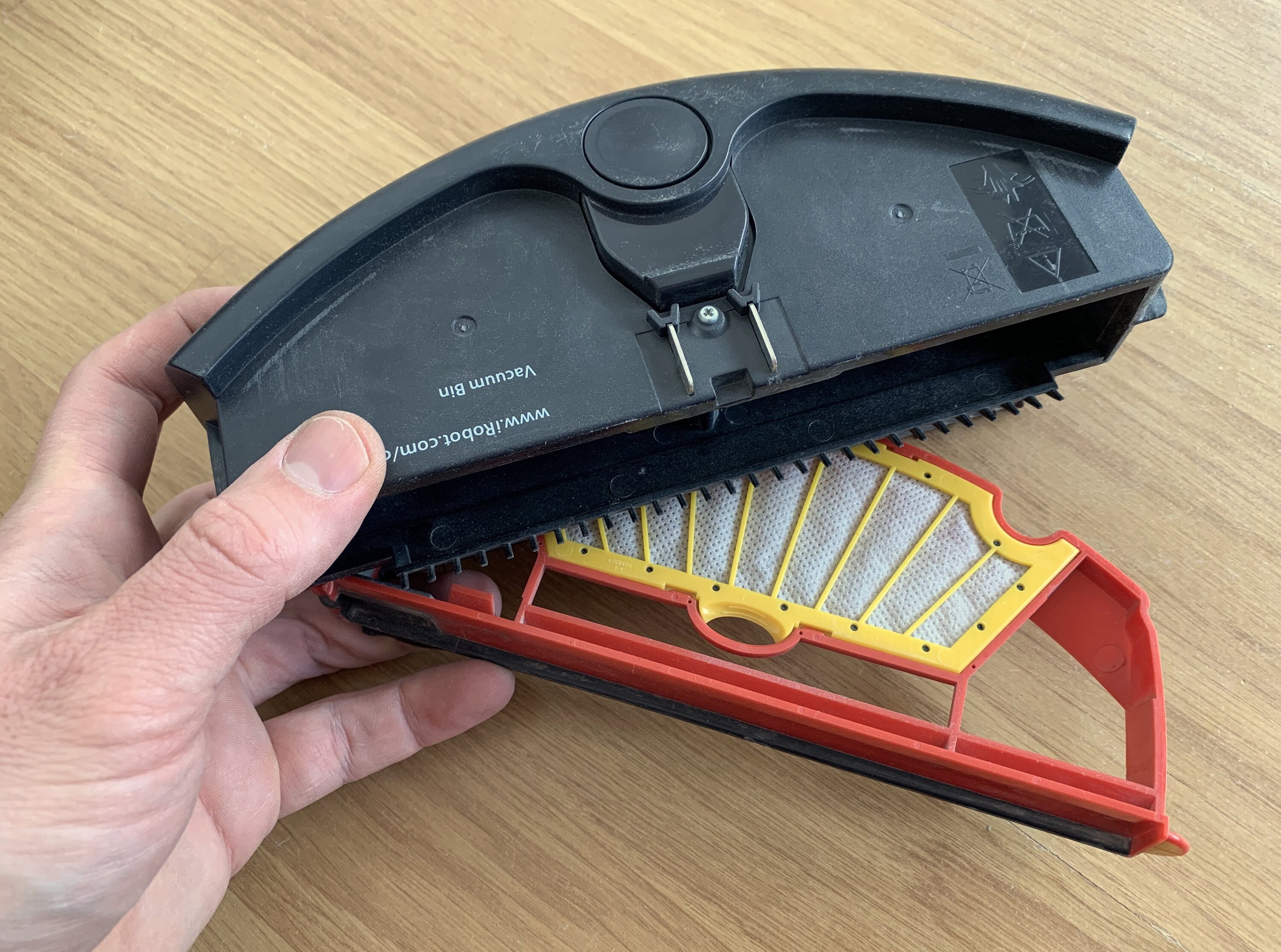 Zu guter Letzt sind da noch der Staubbehälter und der Filter. Da ich Niederländer bin (und irgendwie geizig, auch bekannt als "ons bent zuunig"), tausche ich den Filter nicht aus, sondern reinige ihn. Sie werden es nicht glauben, aber dies ist der Originalfilter - im Einsatz seit 2011. Alternativ verkauft Ihnen iRobot gerne Ersatzfilter für 40 Dollar.