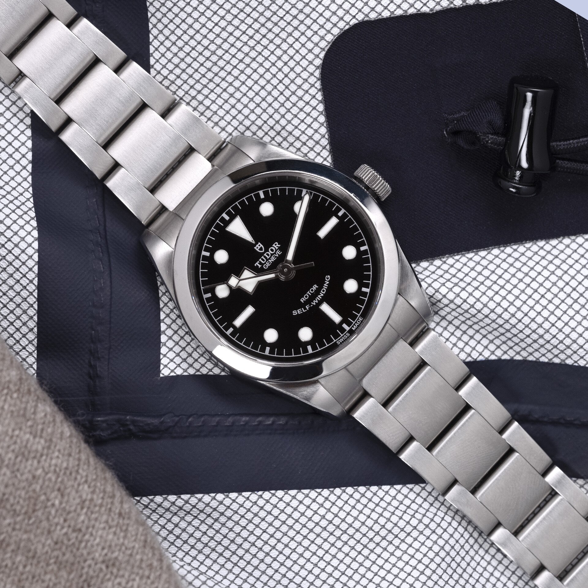 Genau wie die frühen Tudor-Uhren folgt diese Black Bay 36 den klassischen Linien des (Rolex) Oyster-Gehäuses, das als Meisterwerk des Uhrendesigns gilt. Seinen Namen verdankt es der Wasserdichtigkeit, wie eine Austernschale, die sich schließt, um ihr Inneres vor dem Meer zu schützen. Sie sitzt wunderschön am Handgelenk.