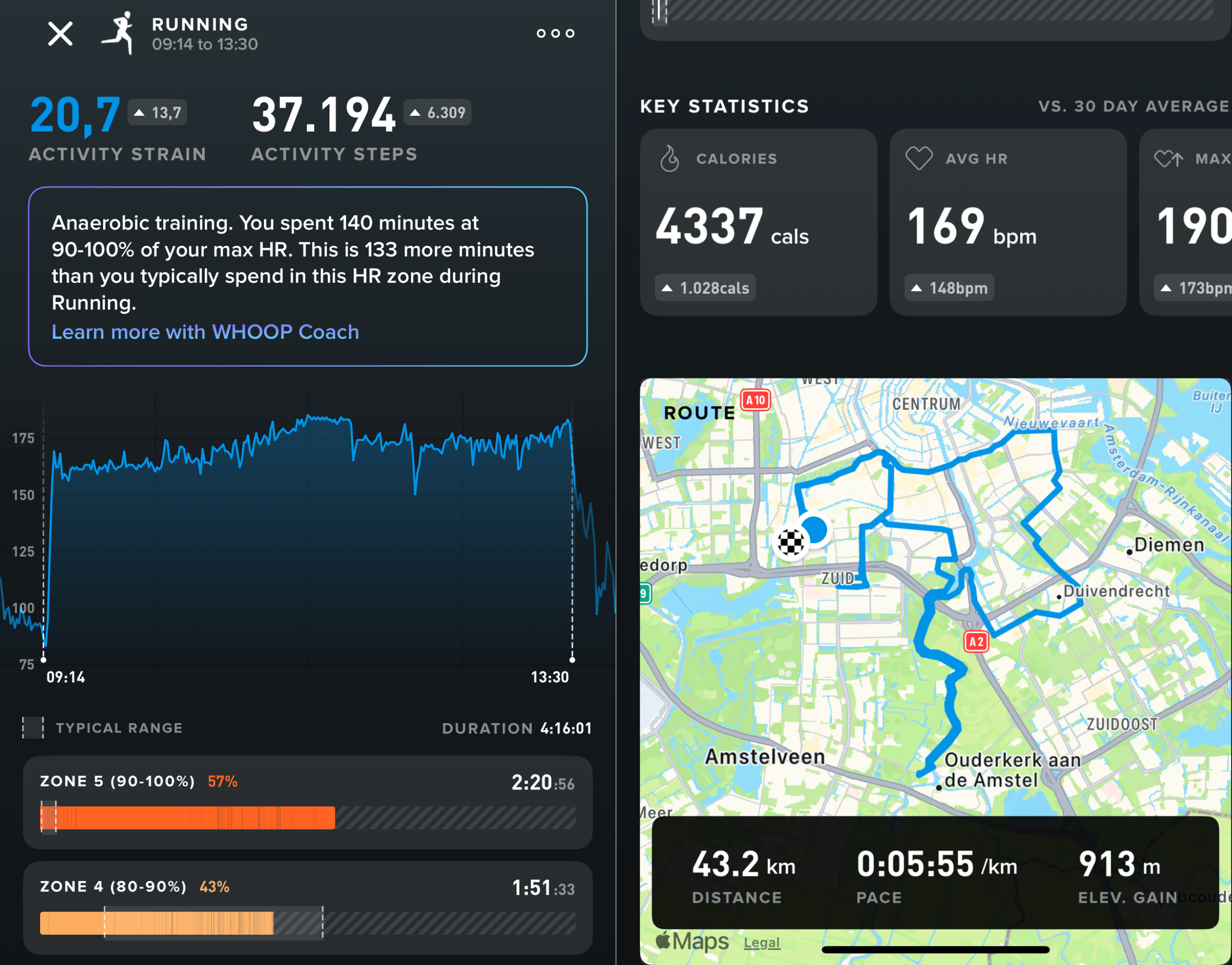 Den ersten Marathon lief ich ohne Echtzeitdaten. Ich verließ mich ausschließlich auf mein Gefühl, trug eine analoge Uhr und "maß" die Distanz, indem ich einfach die verschiedenen Wegweiser entlang der Strecke im Auge behielt. Ich wählte mein Tempo nach meinem Körpergefühl und versuchte, Geschwindigkeit und Ausdauer auszubalancieren. Ich trug zwar meinen WHOOP, aber er lief im Hintergrund und lieferte mir nach dem Rennen Herzfrequenzdaten.