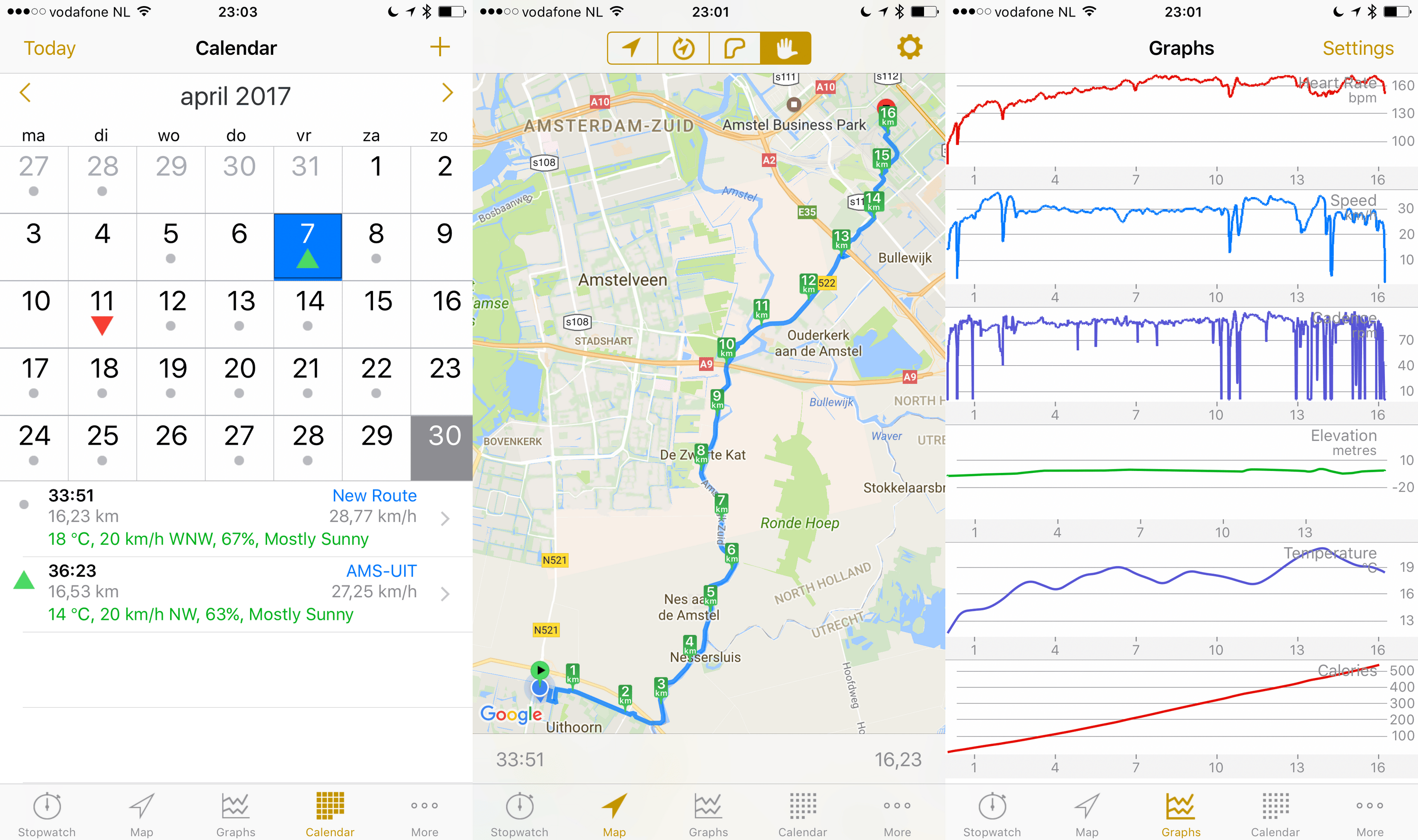 I also used the smartwatch when sporting (road cycling). The watch can work in combination with the smartphone (and Bluetooth sensors) to collect data on speed, cadence, heart rate and distance information. You can combine and compare this data to previous trainings, providing a clear view on progress and fitness.