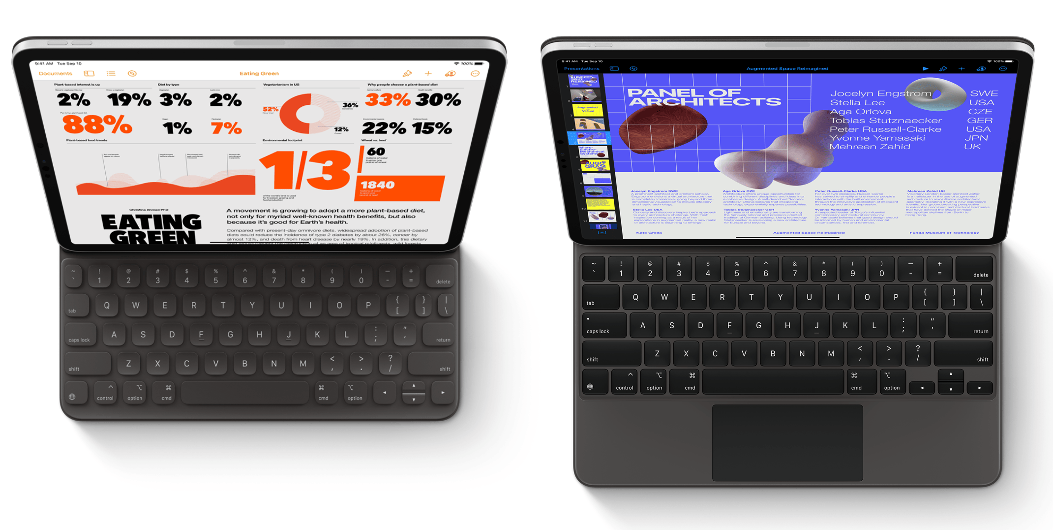 The new Magic Keyboard is Apple's latest and greatest companion product for iPad Pro. It is an advanced, metal enforced, folding stand that includes a keyboard and trackpad. It is extremely sturdy, and because of this it is heavier. You cannot use the iPad as a tablet when it is connected to the Magic Keyboard as its folding mechanism does not allow flapping around. The backlit keys have a conventional scissor mechanism, providing 1MM of key travel. The typing experience is superb, very much like an high-end laptop.