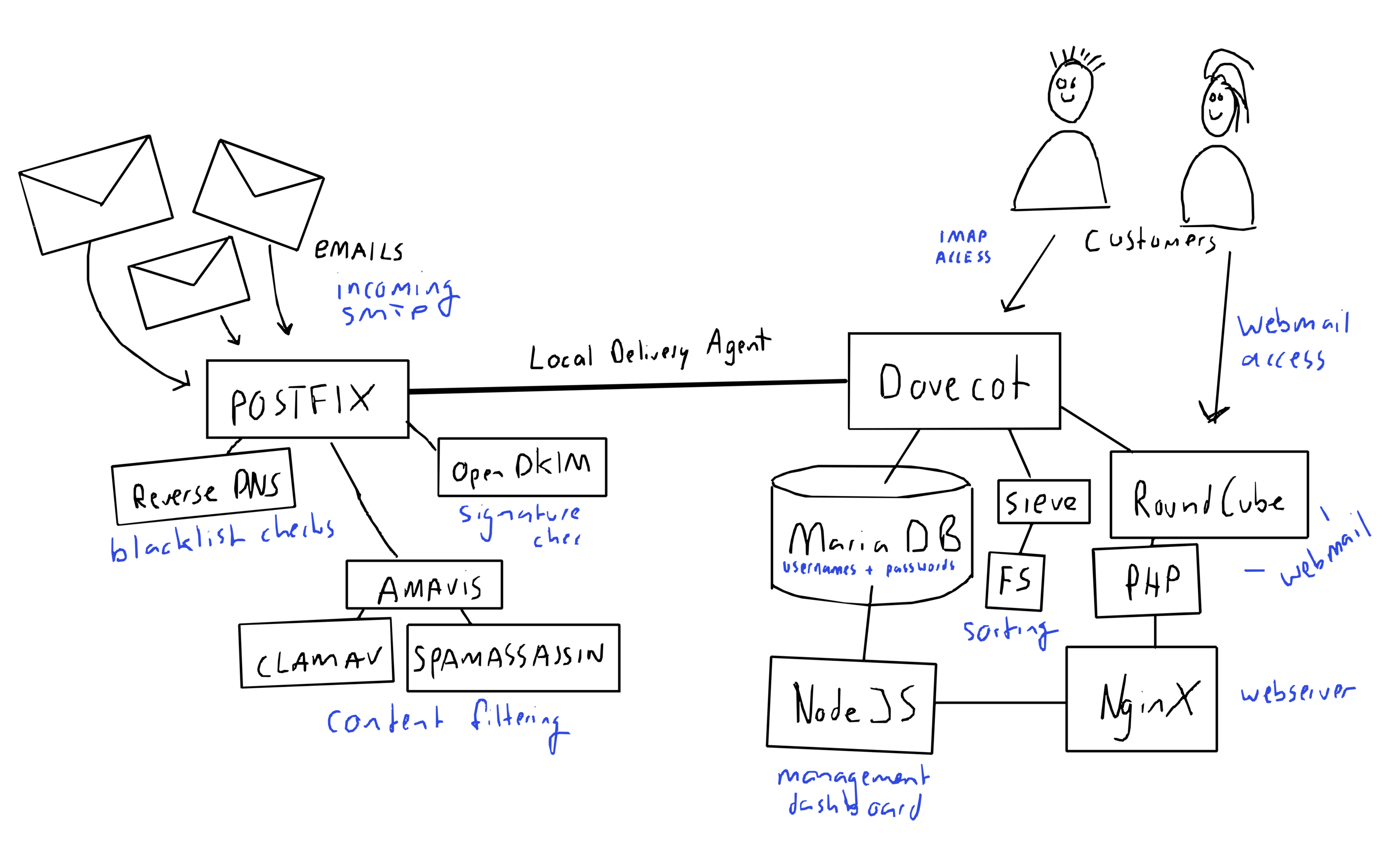 The thing with email services is that it is hard. Not because of a single component being difficult, but because to run a complete email stack you need many different parts working together seamlessly. Here are some of the pieces that comprise my company's mail service: