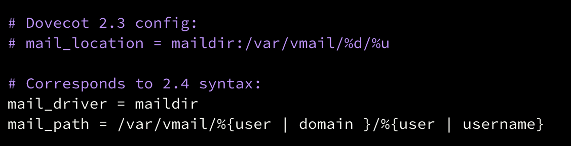 - New config syntax and variable system: Parameters like `ssl_cert`, `mail_location`, and `%d` have changed format and meaning.