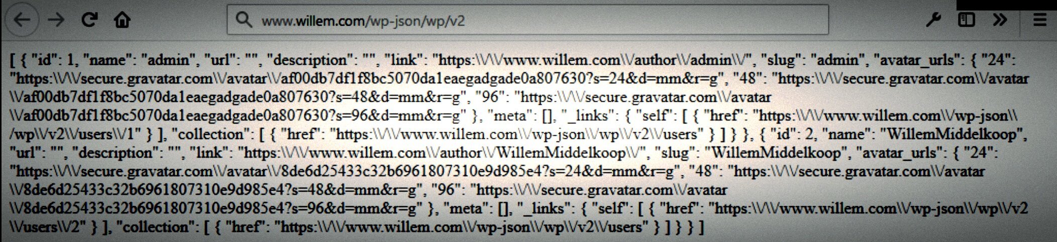 La API REST de WordPress proporciona acceso a todos los datos que están disponibles en tu sitio web en formato JSON legible por máquina. Se puede acceder fácilmente a publicaciones, páginas, categorías, etiquetas, comentarios, medios, usuarios, configuraciones y más. Por ejemplo, intenta agregar esta parte a la dirección de tu sitio web: /wp-json/wp/v2/users para obtener una lista de todos los nombres de usuario válidos de tu sitio web, ¿quieres compartir eso con los hackers?