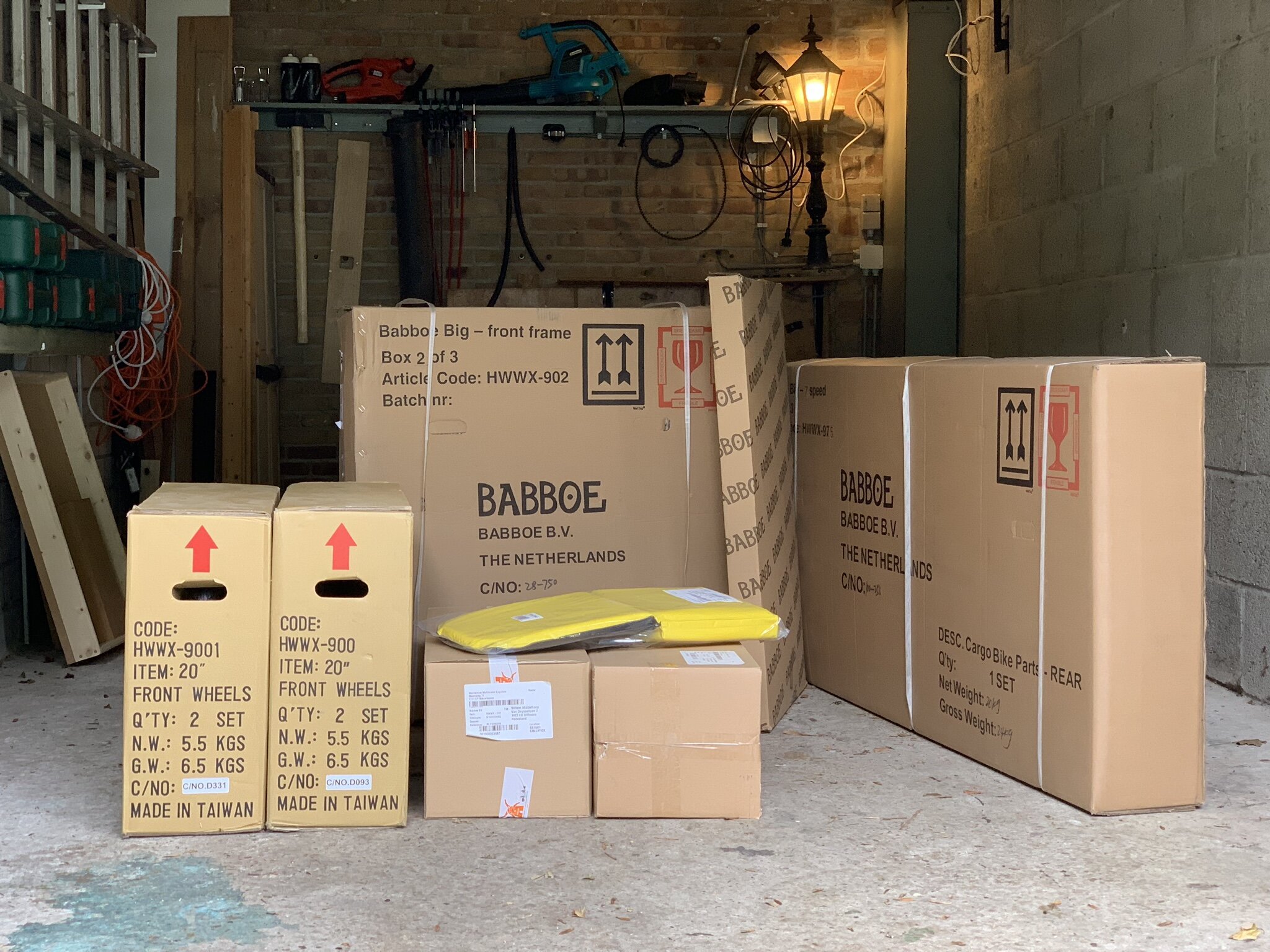 La bicicleta llega en muchas cajas diferentes, que contienen ruedas, partes del cuadro, partes de la caja de carga de madera y la parte trasera semiensamblada de la bicicleta. Es una muy buena idea pensar dónde vas a tener tu fiesta de construcción. Montar la bicicleta puede llevar horas y realmente no querrás mover todas las piezas, tuercas y tornillos.