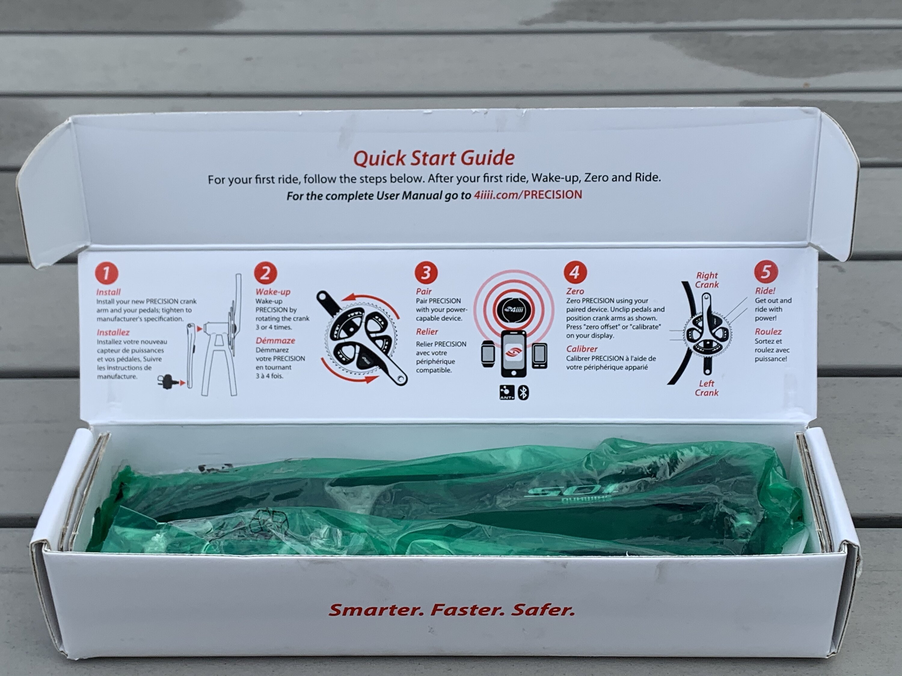 El medidor de potencia 4iiii Precision viene en una pequeña caja con una clara instrucción de 5 pasos impresa en ella.