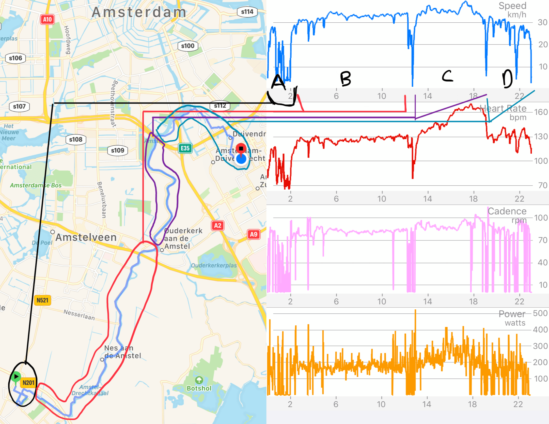 - entre B y C: alrededor de 13 KM, justo entre el segmento B y C es donde se ve claramente una caída en todos los gráficos. Esta es la ciudad de Ouderkerk aan de Amstel donde se realizan trabajos de construcción en el puente Amstel. Claramente afecta mi recorrido, con picos de potencia mientras me preparo para pasar el puente (una ligera elevación que me gusta tomar de pie sobre mis pedales).