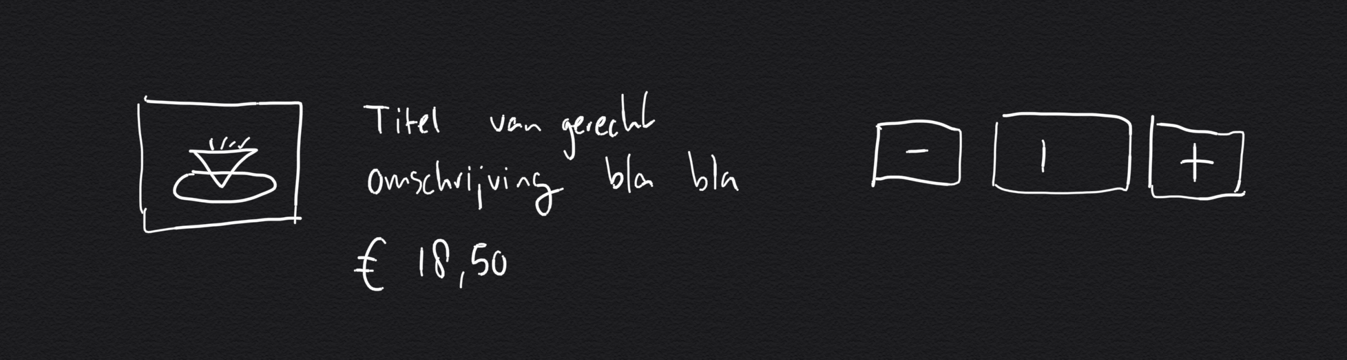 El boceto de arriba muestra mi idea inicial para la interfaz. Puedes ver una imagen, un título, una descripción del producto, el precio, botones de más y menos y un cuadro que contiene la cantidad de productos que has comprado. Puede parecer un buen (y simple) comienzo, pero este diseño es defectuoso porque: