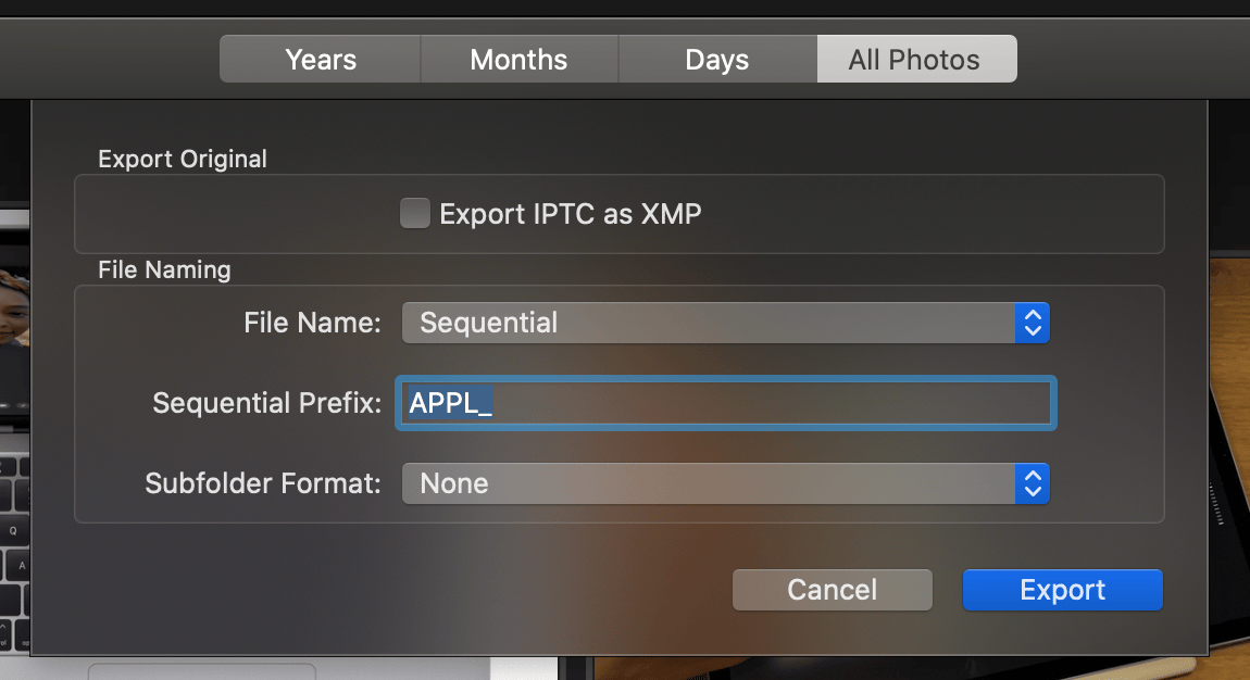 Después de limpiar mi biblioteca, la actualicé a Apple Photos. Este último funciona mejor en computadoras Apple modernas, como mi potente iMac. Con Apple Photos puedes exportar los originales sin modificar todos a la vez. Selecciona (todas) tus fotos y elige "Archivo" > "Exportar originales sin modificar". Utilicé nombres de archivo secuenciales con un prefijo establecido manualmente. Esto me permitió cambiar el nombre por lotes utilizando las fechas de creación EXIF en un paso posterior. Exportar los originales llevará algún tiempo dependiendo del tamaño de tu biblioteca.