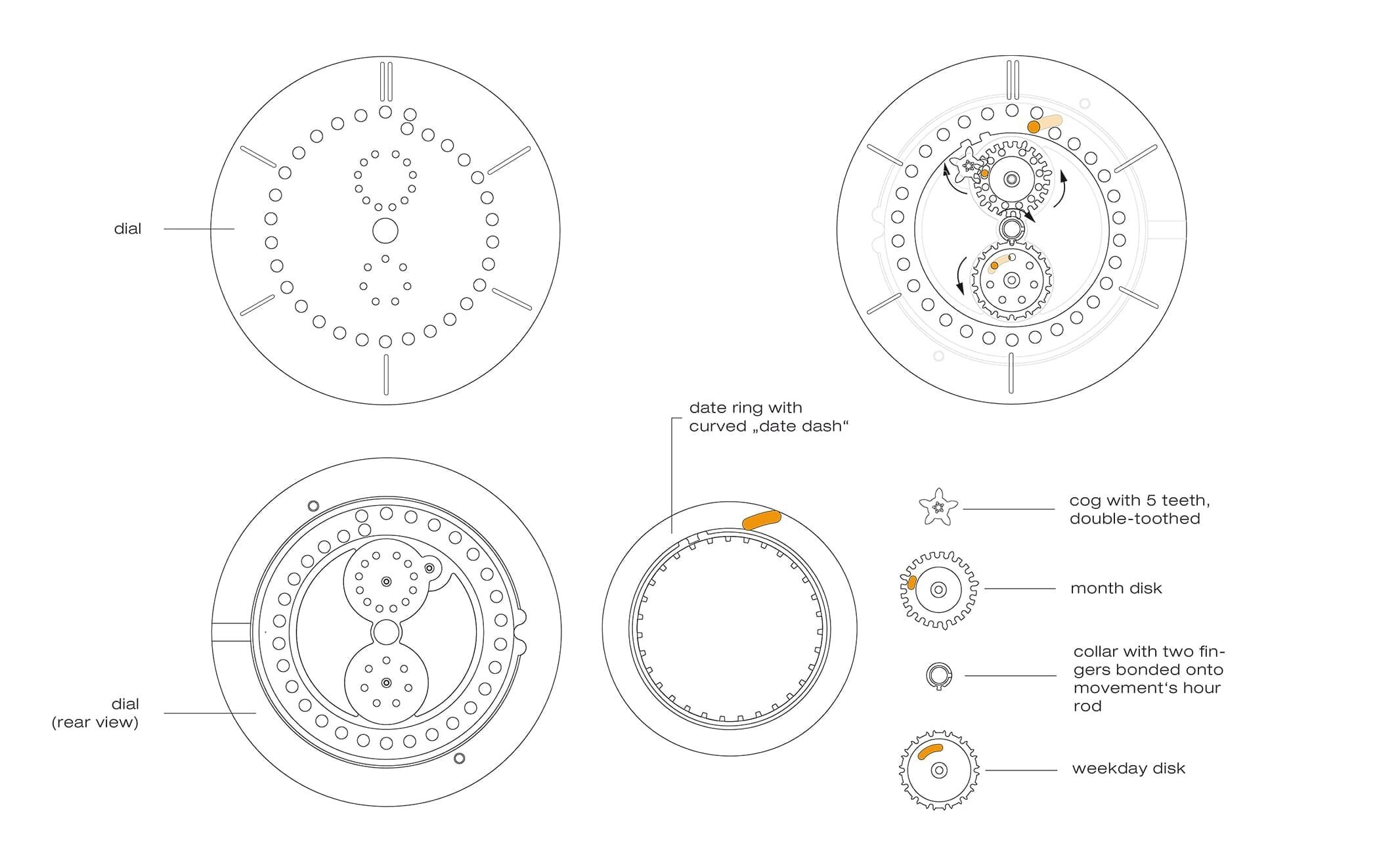 El reloj es un llamado "calendario anual", lo que significa que puede mostrar la fecha correcta con un solo ajuste manual por año (durante febrero). Un calendario anual "sabe" la diferencia entre meses cortos y largos. En la alta relojería, esta es una complicación de gama alta, que a veces requiere más de cien piezas adicionales. ¡Gracias al brillante diseño de Oechslin, este reloj solo utiliza 3 piezas adicionales!