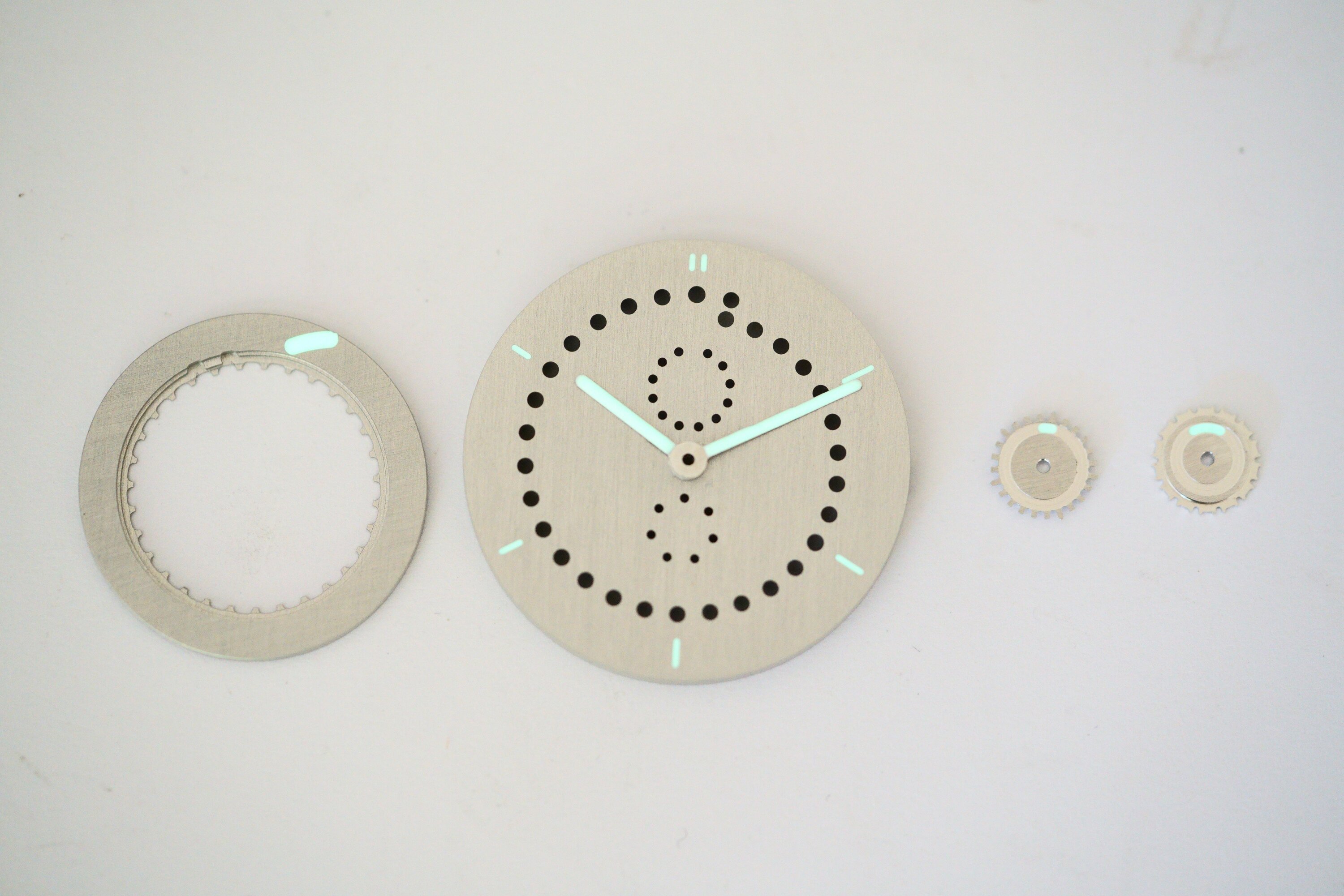Mi reloj está hecho de titanio (que es ligero y duradero), es pequeño (36 mm de diámetro), es impermeable (con una corona atornillada), las manecillas son luminosas (visibles en la oscuridad), tiene un movimiento automático (no requiere pilas ni cuerda manual) y sus colores son fieles al material (sin superficies pintadas).