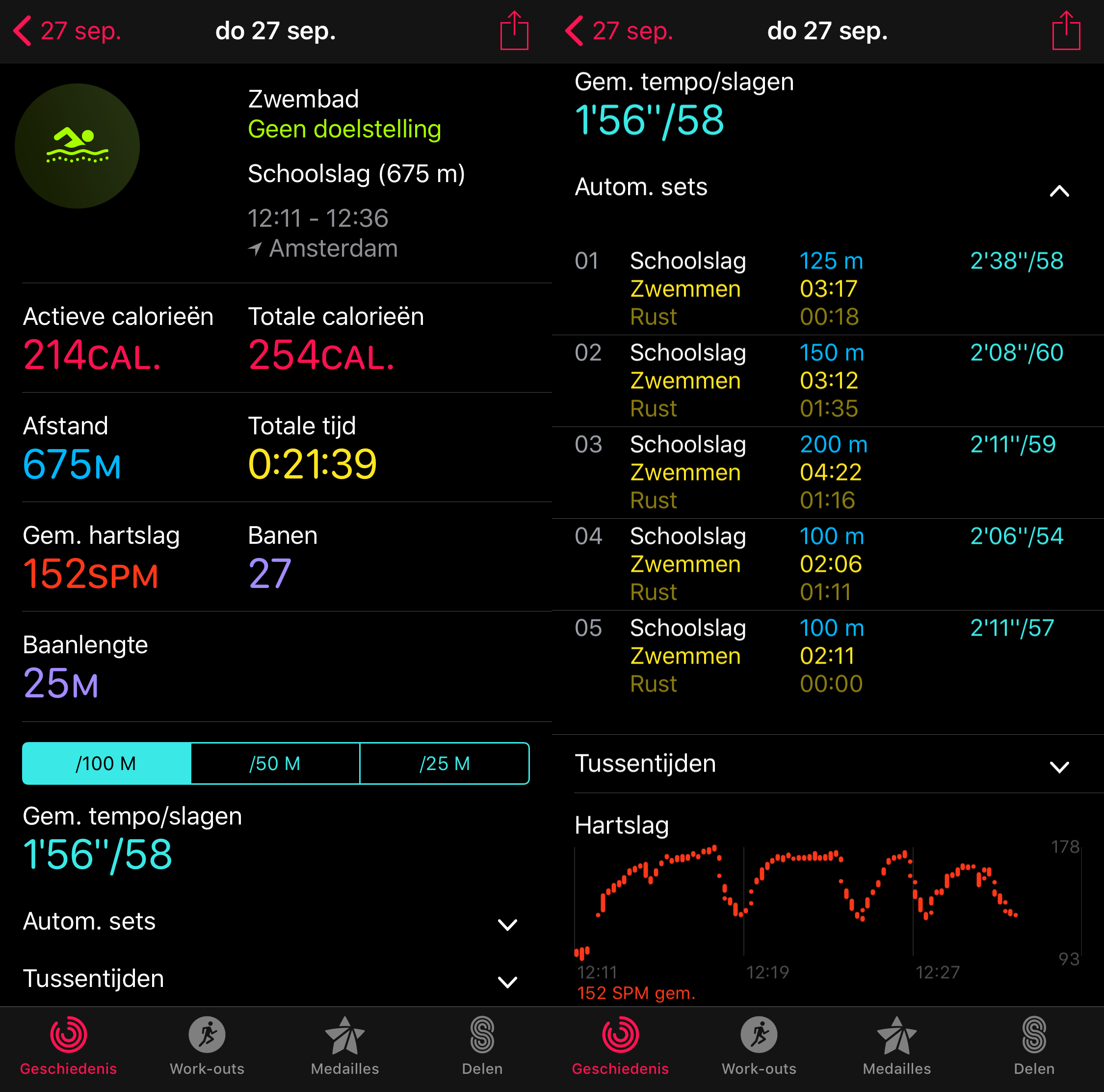 Met je iPhone kun je de zwemsessie gedetailleerd analyseren. De Apple Watch synchroniseert de zwemgegevens automatisch zodra deze weer binnen het bereik van je telefoon is. Je hoeft je telefoon niet in de buurt van (of in) het zwembad te brengen. Het is verbazingwekkend dat het horloge hartslaganalyses kan uitvoeren terwijl het in het water is. Met behulp van de gyrosensoren kan het mijn slagstijl en -duur nauwkeurig identificeren, inclusief de kleine rustpauzes die ik tussen de zwemsessies had.