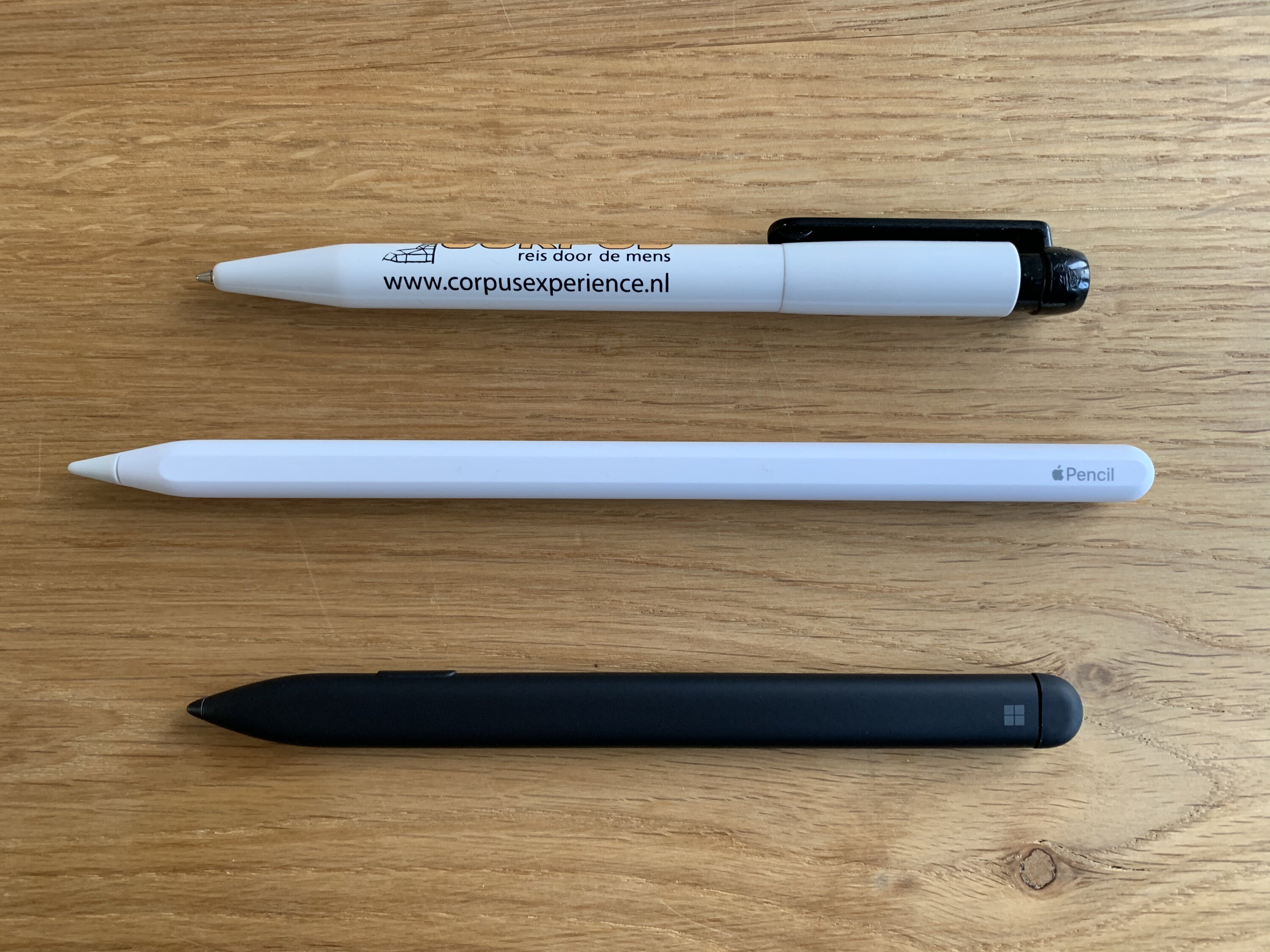 De Surface Slim Pen is qua grootte vergelijkbaar met een conventionele (voor papier) pen. Hij is iets kleiner dan Apple's nieuwste Pencil.