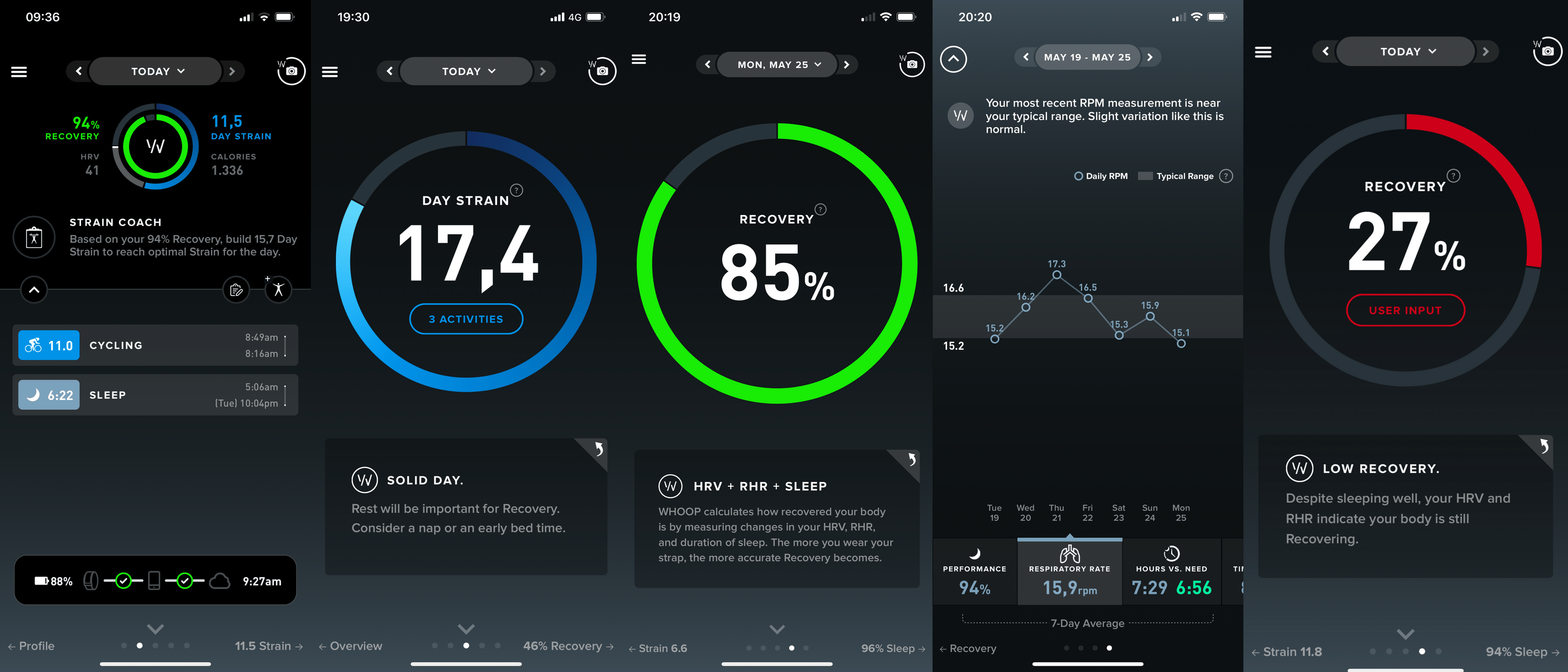 De Whoop app geeft toegang tot gegevens die zijn verzameld door de Whoop sensor. De app consolideert grote hoeveelheden data in twee belangrijke statistieken "strain" en "recovery".