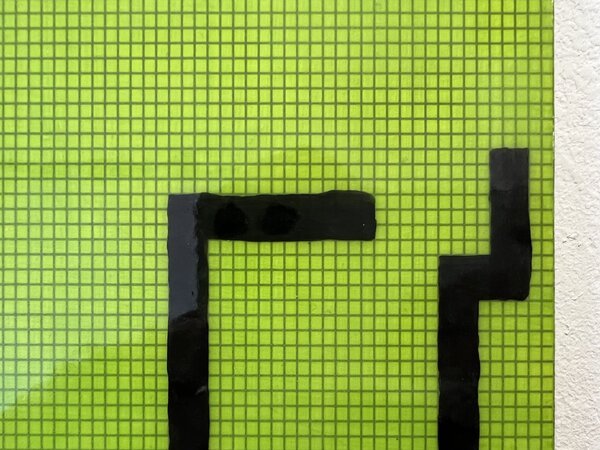 Naast de dot-matrix lijnen op het canvas, gloeit het funky old school groen in het donker. Het kostte haar maanden om de juiste mix te vinden en haar applicatietechniek te perfectioneren. De "High Score" kunstwerken zijn afgewerkt met een plastic-achtig oppervlak, wat perfect de retro vibe van de mobiele telefoonschermen van weleer completeert.
